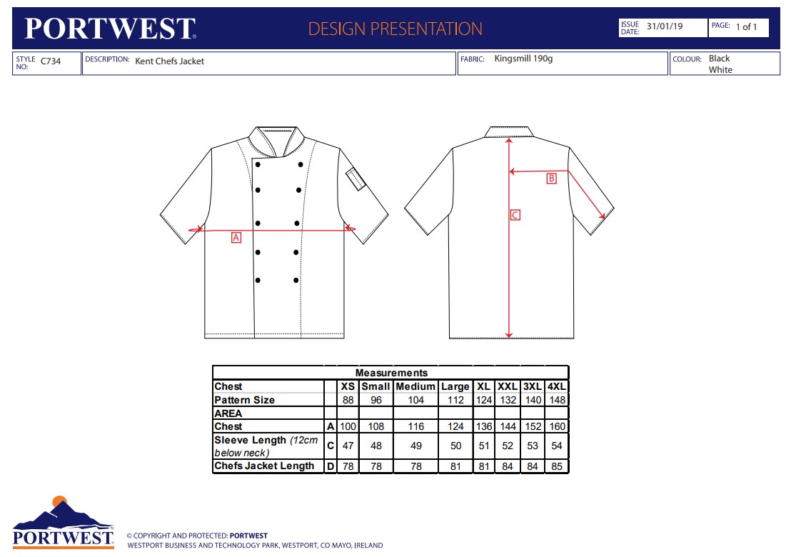 Portwest C734 Kent Chefs Jacket S/S C734