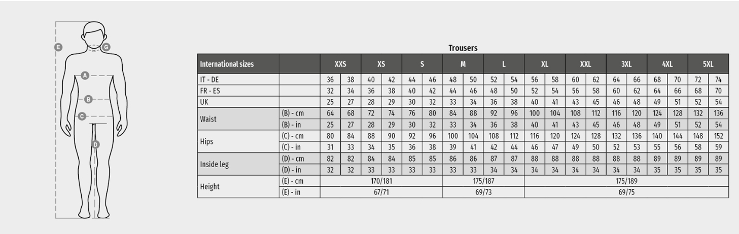 All-season unisex “4-way stretch” trousers, with side elastics and belt loops, closure with zip and customised button. On the front, they have two rounded pockets, a coin pocket on the right, a safety pocket closed with a zip on the left. On the front of the left leg, there are 3 pockets: a horizontal pocket closed by a zip, a pocket with shaped flap closed with Velcro and equipped with a badge holder and a small vertical pocket closed by a zip. On the front of the right leg, there is a retroreflective stripe (except for the Black colour variant). Both trouser legs are equipped with a top-opening knee pad in Nylon Oxford 500D. On the back there are: a pocket with flap closed with Velcro and a pocket without flap but with 2 retroreflective stripes, a hammer ring (right leg), an open tape measure pocket (right leg) and a smartphone pocket with flap and Velcro (right leg), retroreflective inserts at knee height (both legs) (except for the Black colour variant), contrasting kick tapes (both legs). Side seam topstitching and contrasting bartack reinforcement stitching in various points. The middle (Italian) sizes 48-50-52 have an 82 cm regular internal leg length.